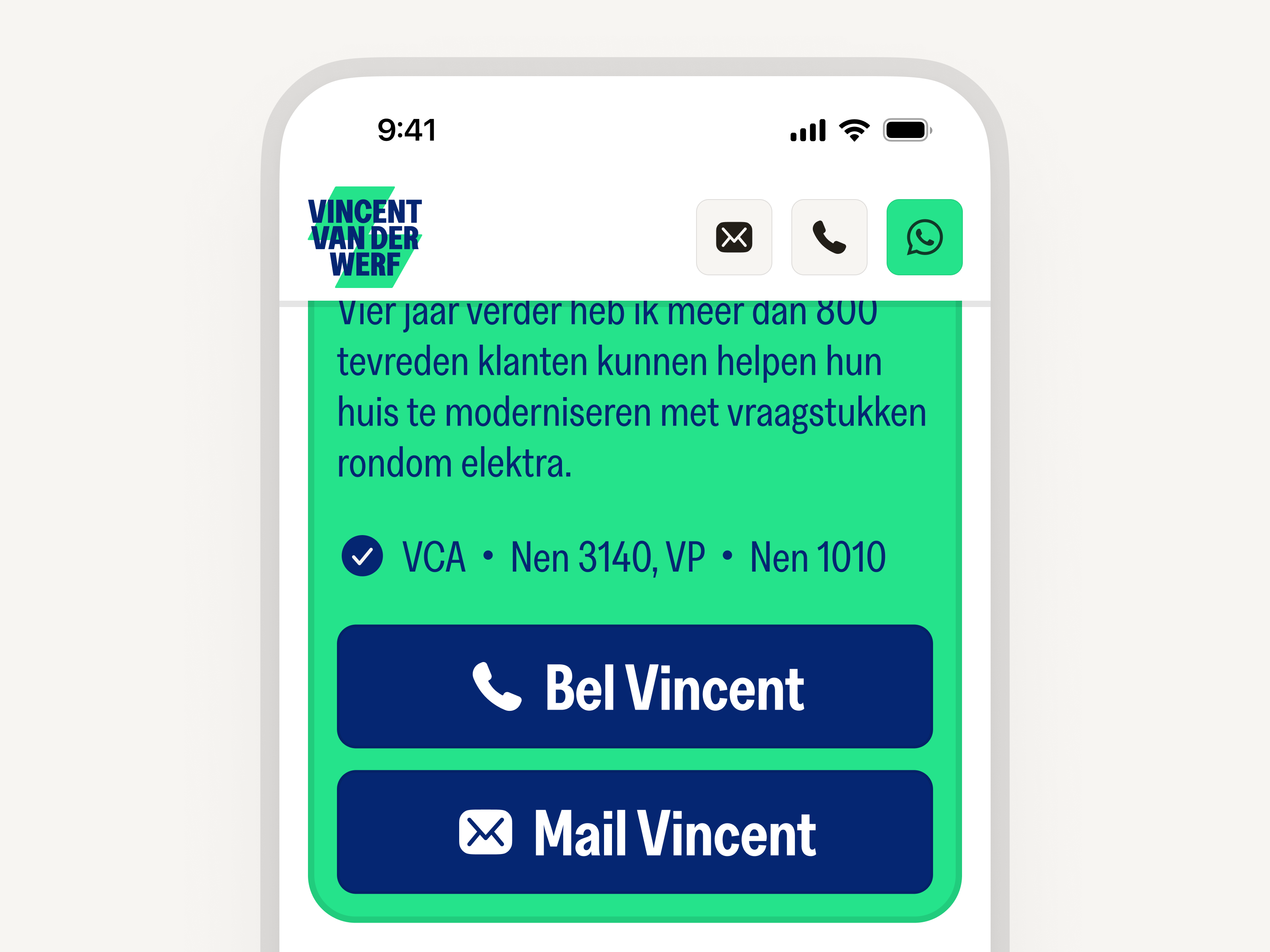 I'll go over this one fast, as my battery's running out. Vincent van der Werf asked us to help him out creating a powerful digital presence. We create a small scalable identity system and website that helped him jump up in search results. Electrifying.